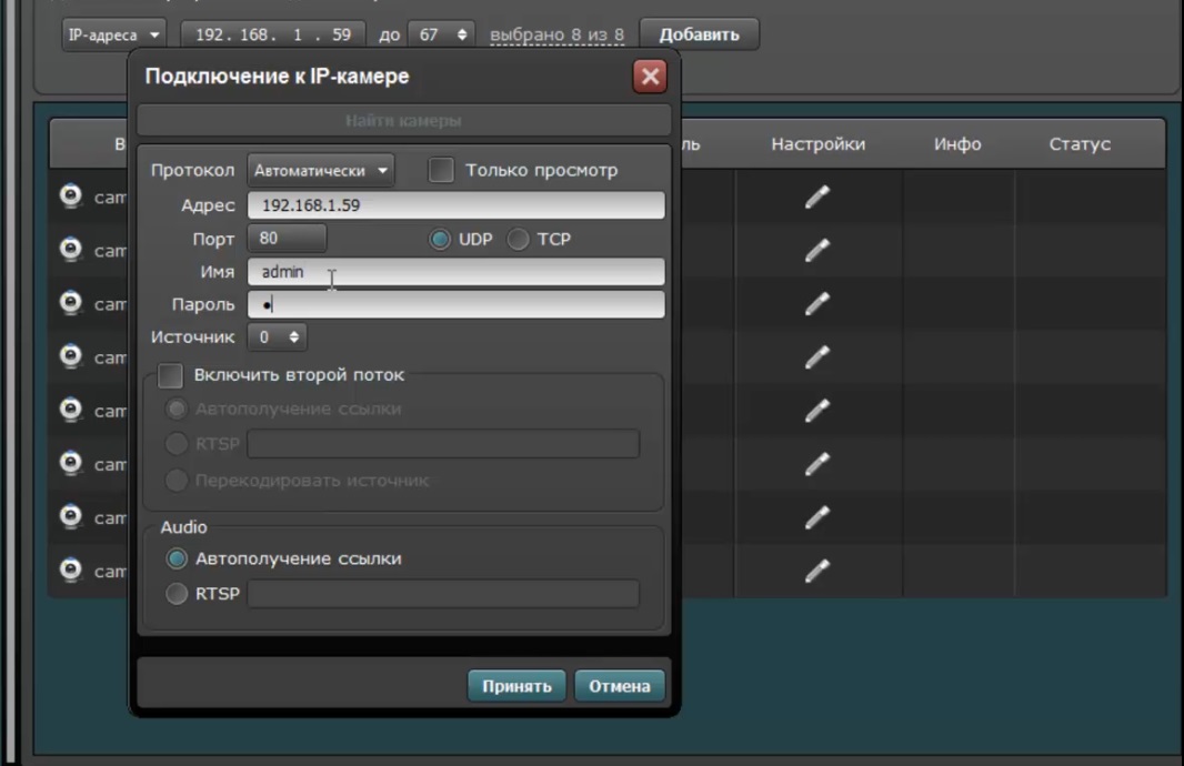 После указания диапазона адресов введите данные для авторизации. Данное действие выполняется только один раз и применимо сразу ко всем камерам.
